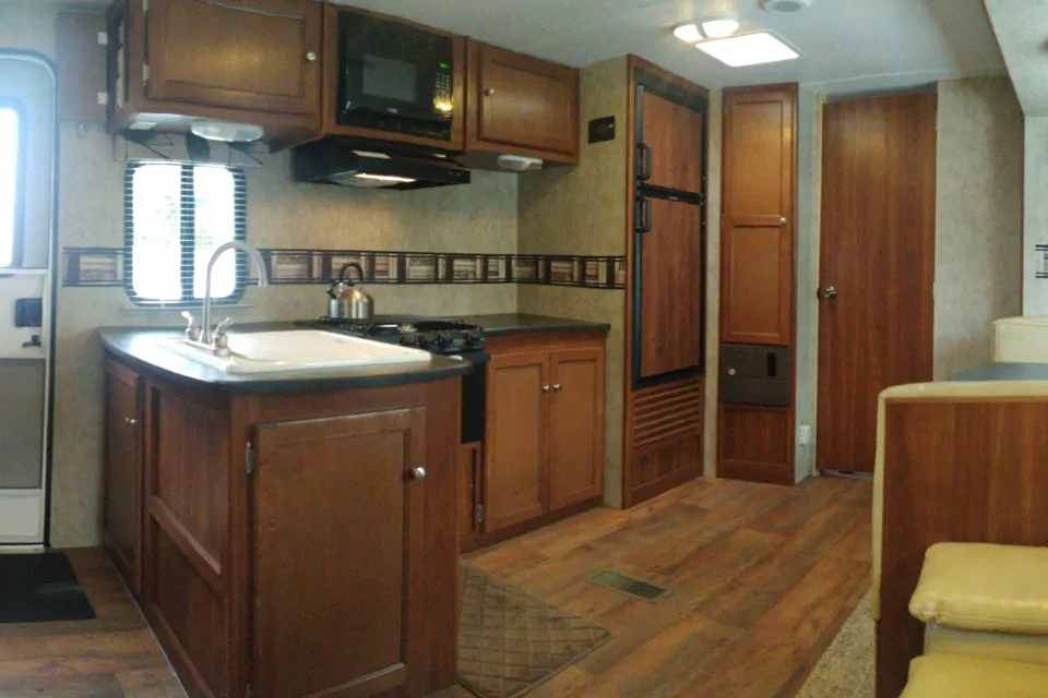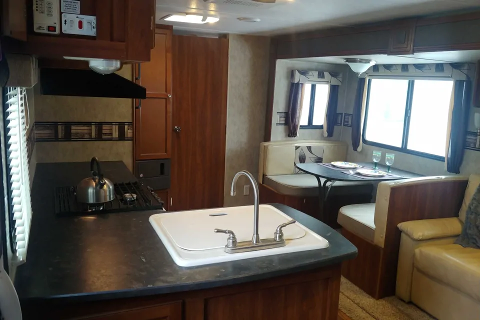 Big open floor plan with lots of counter space to get those camping dinners ready.
