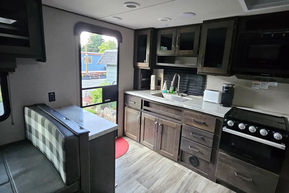 Enjoy a coffee or tea from the Kuerig as you rest under the shade of the awning, while music is playing softly in the back ground on the exterior speakers.