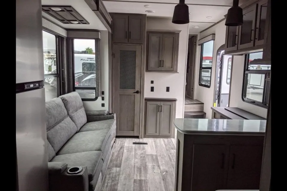 The Living Room has an electric fireplace, a 55" Vizio Smart TV, and a 3-seat recliner with heating, massage, and USB ports. There is a large few shelf pantry located in the living room for storing all your goodies for your trip!