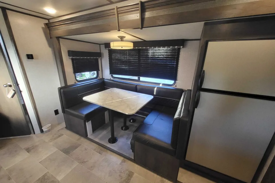 Fully equipped trailer offers a delightful retreat with all the amenities you need for a comfortable stay. Dry weight is 5,620 lbs.