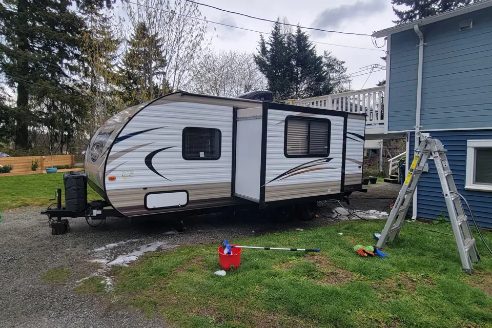 2017 Forestriver wildwood 232rbxl bought brandnew in 2017, it has a full bathroom with a toilet, sink and vanity and full size shower, the kitchen has a slide out where the dinning table is that can also be converted to a double bed. There is a queen bed up front that folds up into the wall and reveals a leather love seat. There is lots of storage for all your items throughout the trailer including underneath the bed, which can be accessed from inside or out.