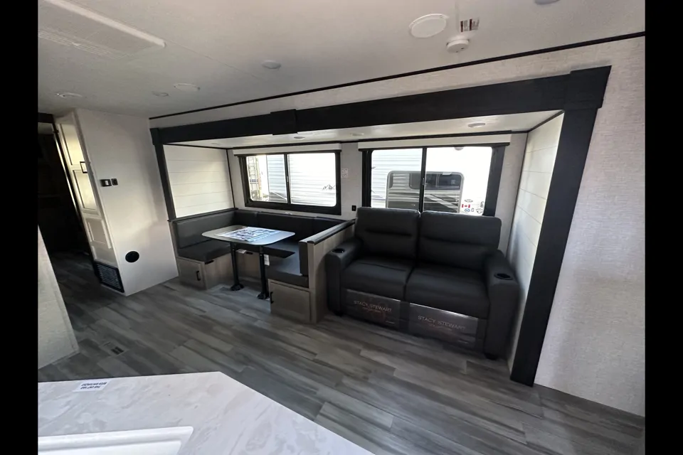 This trailer provides plenty of sleeping options with a queen bed up front, bunk room in the back & a fold down sofa & dinette! This unit offers a large power awning, LED light strip underneath the awning, outdoor speakers, outdoor kitchen with mini fridge & an outdoor shower.