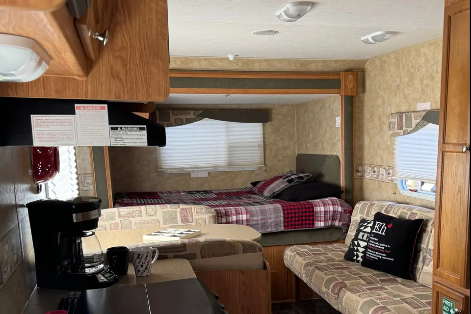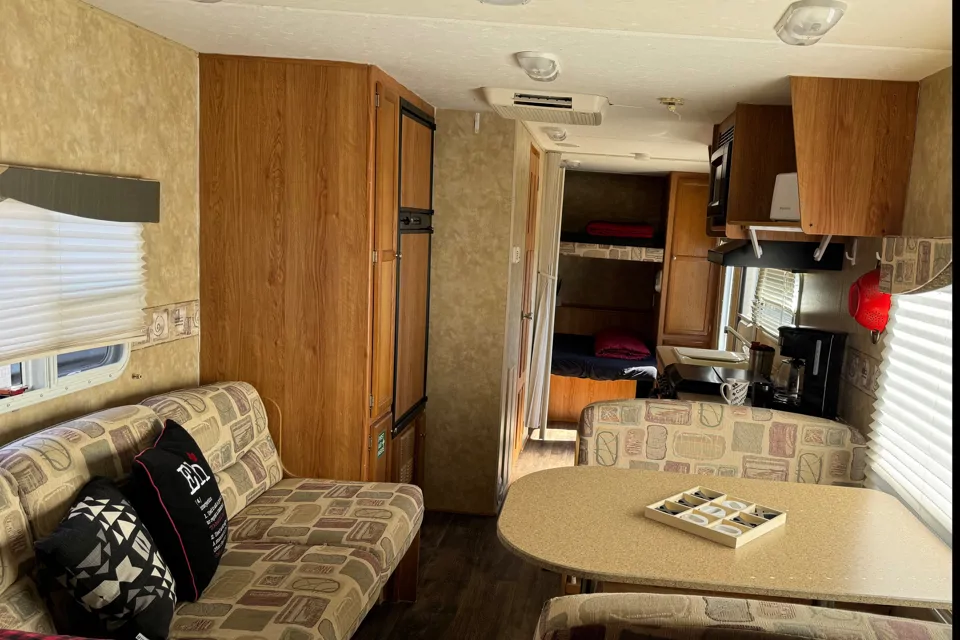 This charming trailer is perfect for your getaway! It comes fully equipped with all the essentials: linens, towels, dishcloths, a toaster, pots and pans, a coffee maker, utensils, camp chairs, a propane fire pit, a barbecue, an outdoor rug, a folding table, dish soap, hand soap and toilet paper! Just bring your food and clothes, and relax without the hassle of packing every single item. It can comfortably accommodate up to 7 adults.