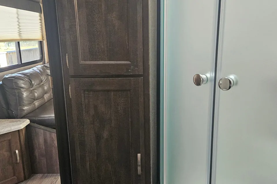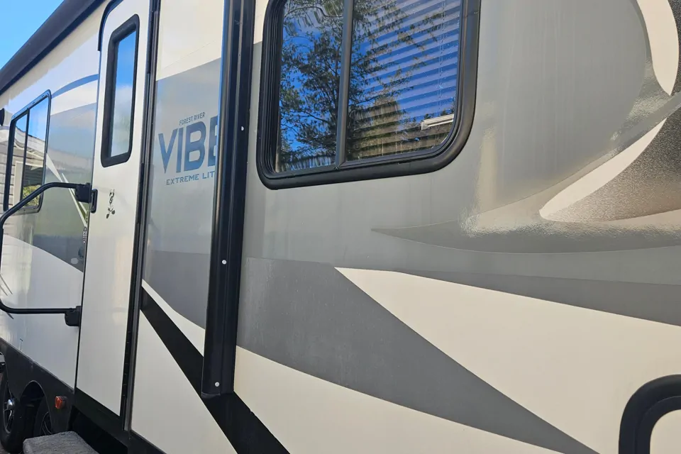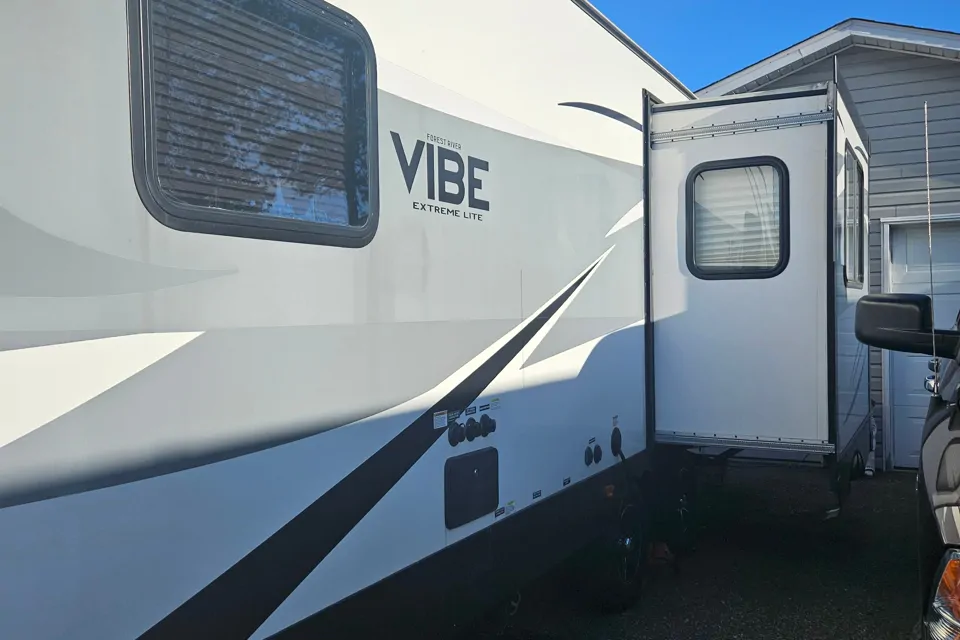 28' Forest River Vibe. Unique layout makes kitchen and eating area very open. Enter the bathroom from both the bedroom and entrance way.