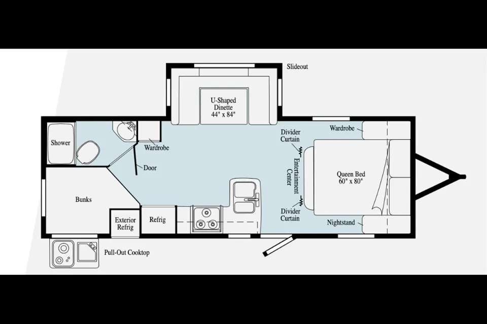 This trailer is 24 feet long with a dry-weight of 5320 lbs (GVWR 7000 lbs on two axles). Perfect for a family, with great features such as two double bunk beds, a slideout u-shaped dinette, and an outdoor pullout kitchen. Also includes two solar panels that supply enough power to run/charge most electrical devices. Comfortably sleeps 7 adults.