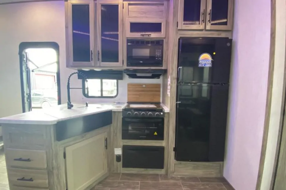 2 bedroom 1 & 1/2 bathroom, sleeps 10. This 5th wheel is 37ft long with 2 slide outs, outdoor kitchen, power awning, "U" shaped dinette and includes camping chairs, propane fire pit, outdoor carpet, dishes, utensils, pots and pans, outdoor games, and much more. Pet friendly, no smoking. I will give a full tour and explain how everything works and will make sure your confident before leaving. Solar panel keeps fridge going but wont run the whole RV.