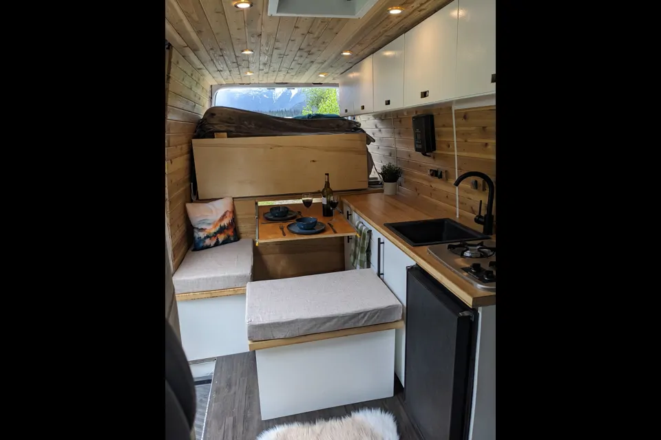 Stumbled across an incredible view? Park up your cabin, go for a dip in the water then cook up something tasty on the double burner stove. Grab a cold one from the fridge (with freezer!) and watch the sun go down with someone special. Three-speed roof fan keeps you cool. The spray foam insulated van helps keep you cool in the heat and warmer in the cold!