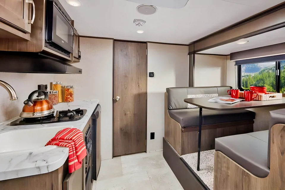 Inside, the trailer is equipped with a queen-size bed and a dinette that converts into an additional sleeping area, providing comfortable sleeping accommodations for up to four people. The kitchen comes fully equipped with a two-burner stove, microwave, refrigerator, and sink, allowing you to prepare and cook meals on the go. The bathroom includes a shower, toilet, and sink.