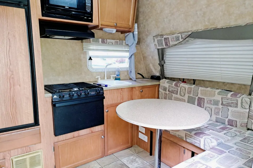 Has gas heater and stove; and if you can hook up to 110VAC, you will get an Microwave and air conditioning, AC outlets too. Sleeps three adults and one child (less than 10 years old).