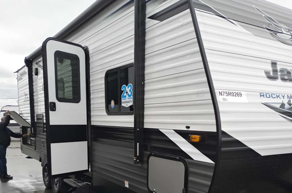 2022 Jayco Jay Flight SLX 8 with Rocky Mountain Package. Delivery and set up!! All pots and pans, utensils, dishes. Residential style kitchen with 3 burner stove with glass cover, oven, microwave, roof ac unit, 32" tv living area and tv in main bedroom with queen size bed. 2 bunks with hookups for all electronic devices. Huge walk in shower with bathroom counter and sink along with mirror and medicine cabinet. Dinette converts to bed as well. Very well maintained, cleaned spotless and good for family or couples. Will consider pets with additional nightly fees upon approval. No smoking of any kind. Please bring own paper towel/napkins, garbage bags, Kleenex, lawn chairs and outdoor BBQ if wish to use. All other items included and for additional fee owner will provide all linens including mattress protector, sheets, pillows with covers and both hand and bath towels.