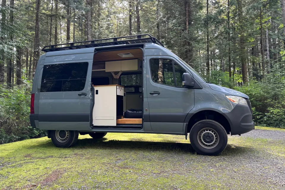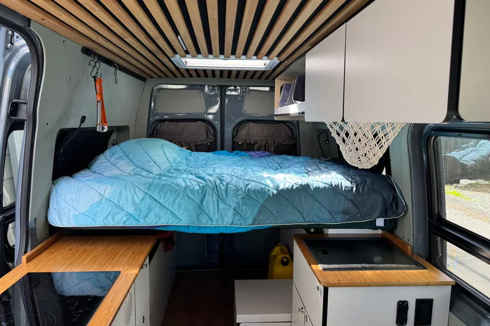 Florencia has it all: cozy, beautiful, and functional. Professionally converted with so many conveniences like an induction stovetop, slide out fridge, deep sink, and lights and outlets everywhere you could need them. Both of the front seats swivel and there is a removeable third seat if you have an extra friend. A convenient little table also pops up for days you need to spend inside. There is a heater for winter and a fan, screened windows, and a skylight for summer. The bed is basically queen size and has a 6-inch foam mattress, note: if you're very tall you might not be able to totally stretch out. Finally, there is lots of storage room for food, pets, clothes, and everything you could need for adventures (more like ad-van-tures). Included: 2 comfortable camp chairs, bed linens, dishes and basic cooking needs, french press and coffee bean hand grinder, and a little gift if you book for 5 nights or more!