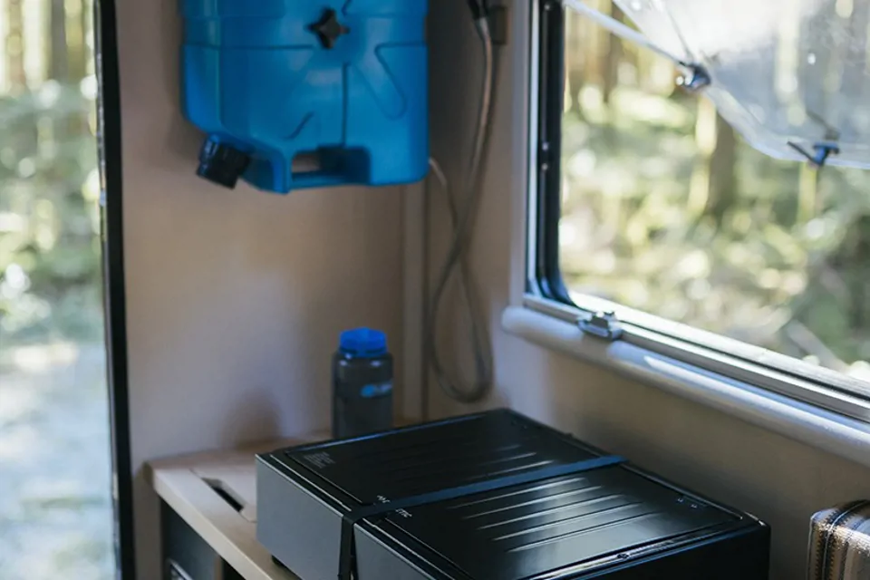 1500 watt power bank. Powers the cooler, heater, lights, etc.