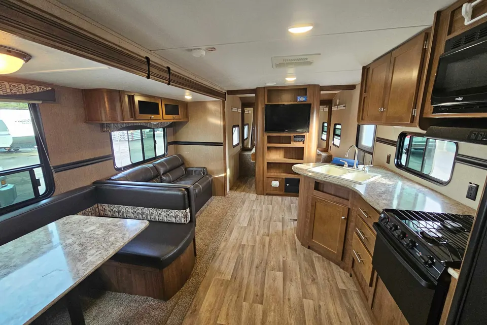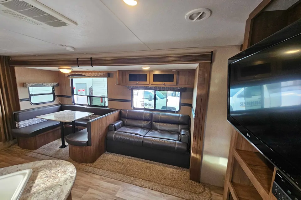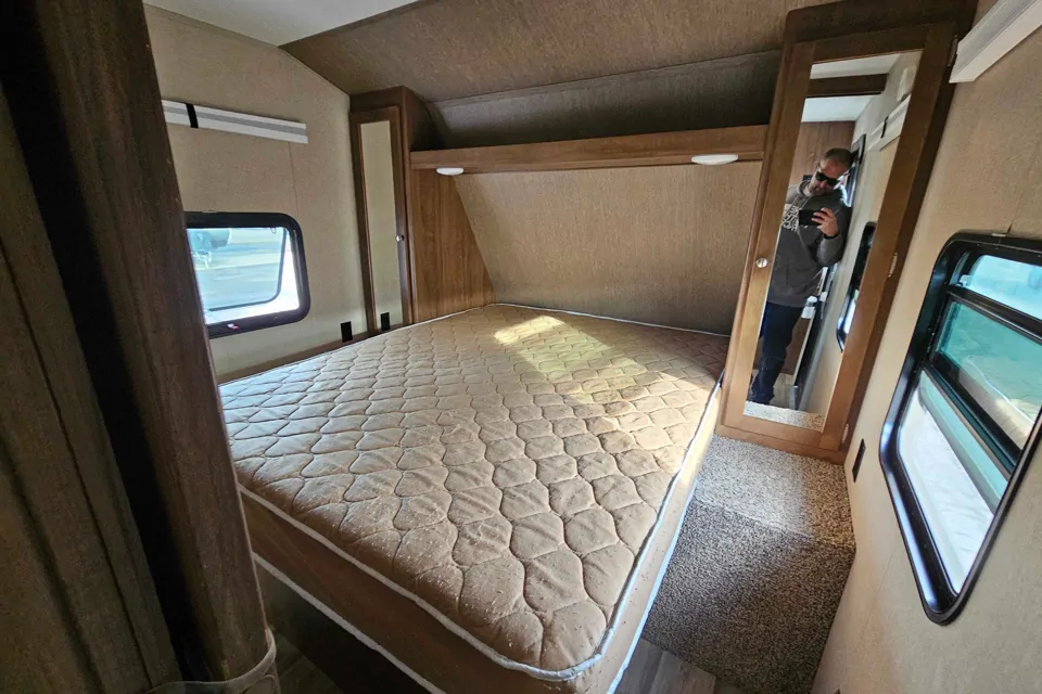 Trailer Features: Sleeps 6-10 (1 RV queen bed with memory foam, 1 double bunk up and one down, dinette that folds into bed and pull out couch - fits 6 adults comfortably. Indoor & outdoor shower, spacious open concept kitchen and dining area. Private master bedroom with storage closets. Electric awning/outdoor lights. Indoor/outdoor stereo with AUX cord. Separate outdoor entrance into bathroom. Air conditioning (only available for full hook up sites or with generator). Generator is available for an extra cost. Included with Booking: Lg Tv with dvd player (can only can be powered if you have a hook up site). Essentials - fitted sheets for bunk, pillowcases, fitted sheet and cover for queen bed, kitchen essentials (plates, cutlery/utensils, basic spices, cooking pans/pots, garbage bags and paper towel. (We suggest bringing sleeping bags/pillows for your own comfort). Indoor/Outdoor games for the family, full propane tanks (Renters are required to return with a full propane tank or choose the pre-payment). Roasting sticks + camping chairs, out door stove and camper bbq with fold up table. Included in Delivery: (**Must choose