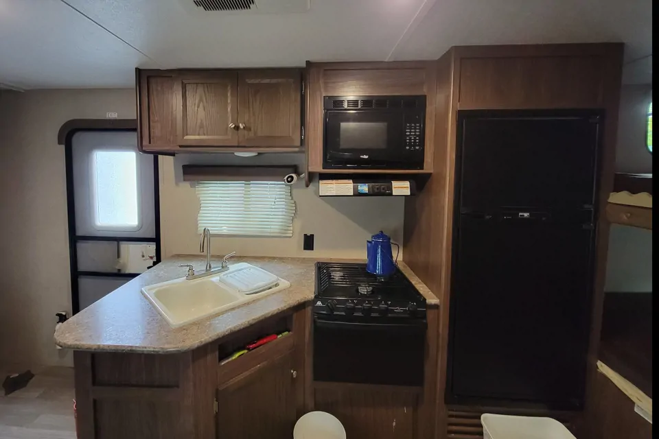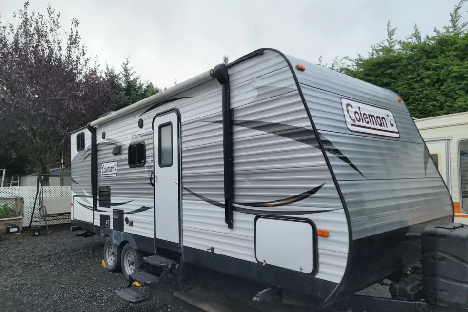 Great for family's! Double bunks with extra padding. Queen bed with topper for extra comfort and fold down table in case more room needed. Two TV's one with built in DVD player. Radio and USB/aux jacks for music inside and out. Power slide and awning for quick set up. Well stocked kitchen and everything you need to go camping can be included so you just need to bring your food and relax. Well behaved pets welcome.