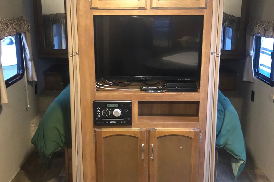 Great layout, queen bed upfront with a new mattress, two closets for clothes and above the bed storage. Double size bunks for the kids and the dinette also turns into a bed. Big fridge and lots of room in the pantry cupboard. Everything you need for cooking. Tv with DVD player and surround sound with lots of movies. Board games for rainy days. Bathroom with a tub and shower. Bonus out door kitchen and shower. Makes camping a breeze with an easy setup. We will allow dogs with a extra deposit.