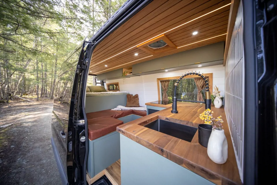 The van is equipped for four season camping, fully insulated with roof fan and diesel heater. Running water, fridge / freezer, chemical toilet, Hot outdoor shower, Queen bed, twin size second bed, the van comes with bedding, cooking equipment, salt and pepper, coffee and tea etc.