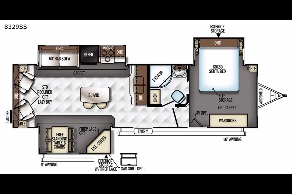 Also Includes: * REAR LIVING ROOM * FIREPLACE * AM/FM/CD STEREO * TV * PATIO AWNING * FRONT & REAR STABILIZER JACKS * 3 SLIDE OUTS * OUTSIDE GRILL * FRONT QUEEN BED * WALK-THRU BATH * DOUBLE DOOR REFRIGERATOR * FREE STANDING DINETTE * MICROWAVE * OVEN * 3 BURNER STOVE * KING SIZE BED