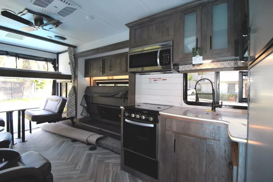 Get away from your bachelor pad in the city and settle in to your bachelor pad under the stars. Full kitchen with range, oven, refrigerator and freezer plays host to comfortable seating for 8.