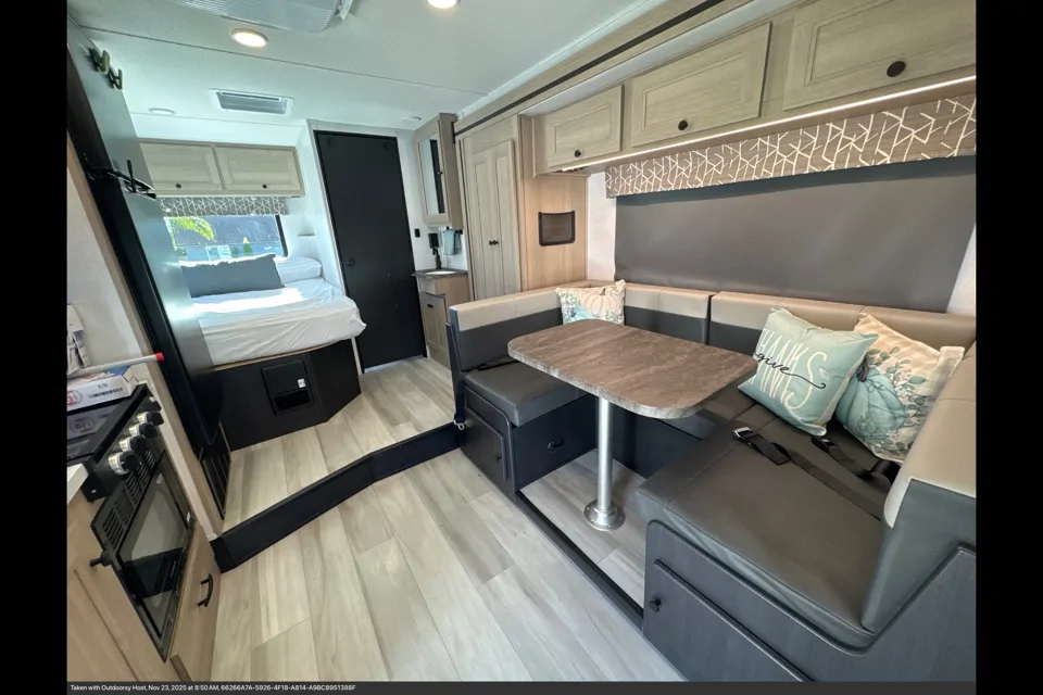 Inside, you’ll find a premium queen bed, a spacious queen-sized overhead bunk, and a sleek U-dinette that converts into another bed. The kitchen features a large countertop, deep sink, convection microwave, 3-burner stove, and a full fridge/freezer, everything you need to cook real meals on the road. The interior is beautifully lit, thoughtfully organized, and stocked with cookware, linens, cleaning essentials, smart tv - that connects your phone, and more. Once parked, the rv’s slide electrically expands the entire width of the kitchen area, giving you so much more space.