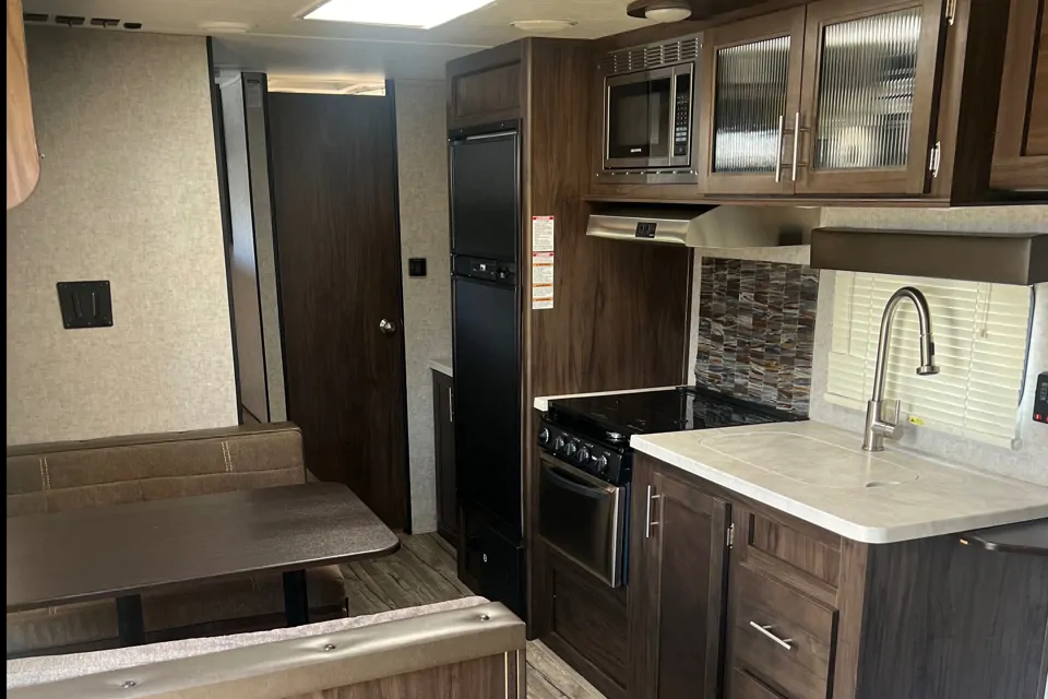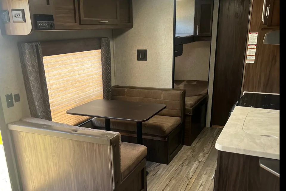 Very clean open layout. This trailer has a queen bed in the front, a couch that folds into a bed, a dinette that transforms into an additional bed, and a bunkhouse.