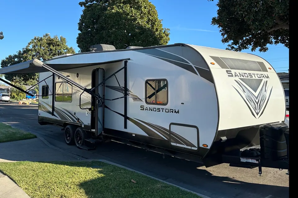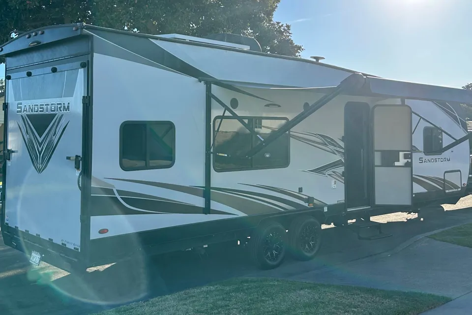 This is our family toy hauler. Perfect for any camping or even just a weekend get away much more to do with it! Has installed the rear patio & tv inside.