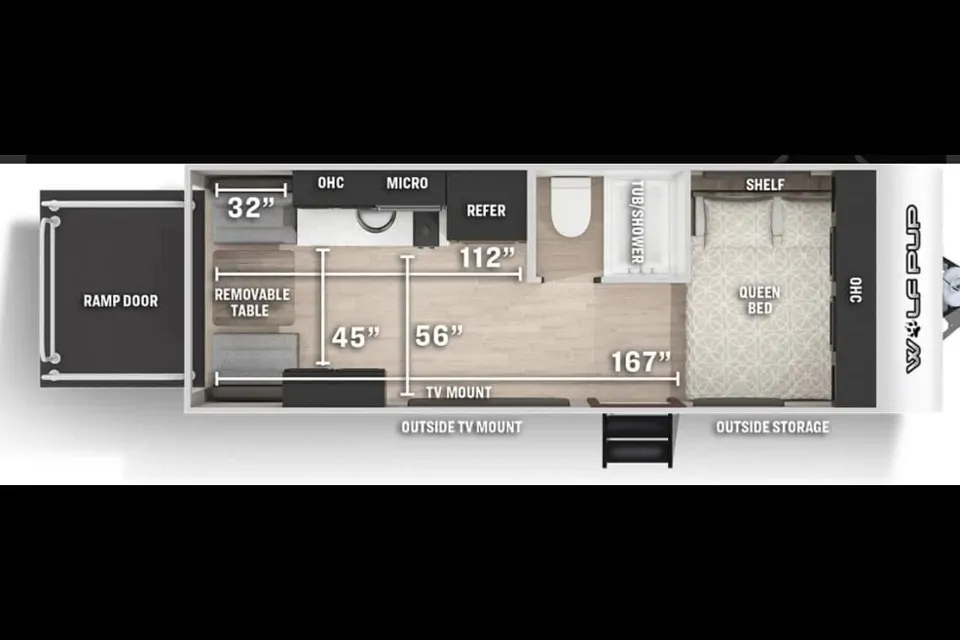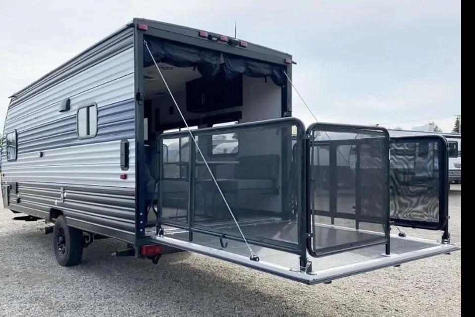 The Wolf Pup 18rjb..It's designed to be lightweight and easy to tow, even with smaller SUVs. The 18RJB features a ramp door that can be used as a patio and includes features like a full-size bed, a dinette that converts to a sleeping area, and a dry bath with a separate shower and toilet.