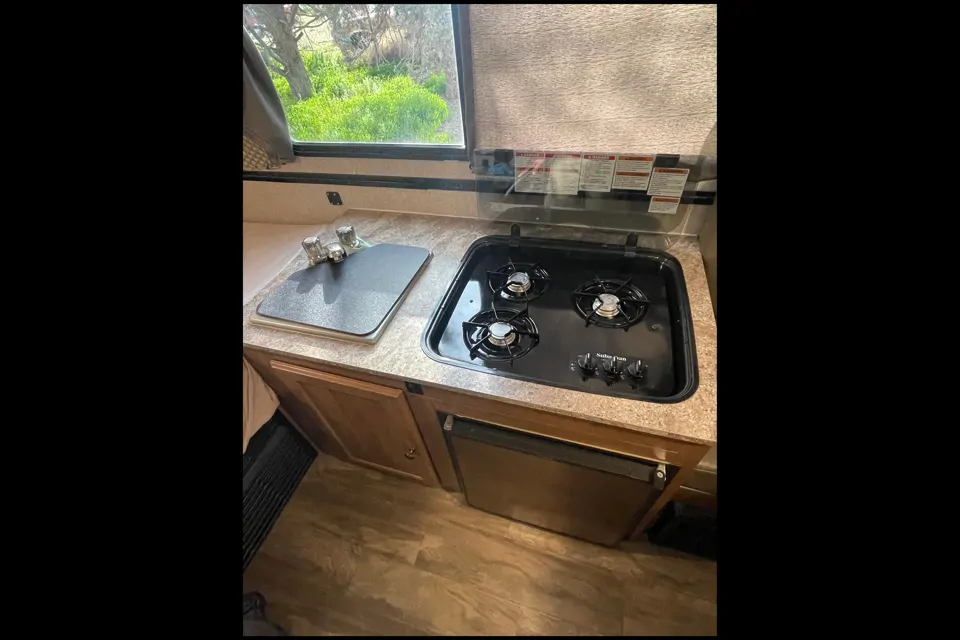 Cozy camping trailer. Perfect for smaller campsites. Sleeps up to 4 people comfortably. Great for couples looking for a nature getaway. It is lightweight and easy to tow. Electric trailer brakes for safer towing with vehicles equipped with a brake controller. The trailer sets up in minutes without having to deal with extending any tents on either side. This camper is equipped with air conditioning, refrigerator, 3-burner stove, microwave, bluetooth stereo, sink with hot and cold water, exterior grill, outdoor shower, queen bed with heated mattress, and dinette that converts to full bed. The front tongue is power operated to make hooking up a breeze. There is a dual battery setup hooked up to a solar panel for extended off-grid dry camping. This unit also has dual propane tanks to supply enough gas to the stove, water heater, grille, fridge, and heater when not hooked up to shore power. Perfect for local campgrounds such as Mojave River Forks, Lake Hesperia, Silverwood Lake, Dogwood, Applewhite, and Glen Helen Regional campground among many others.