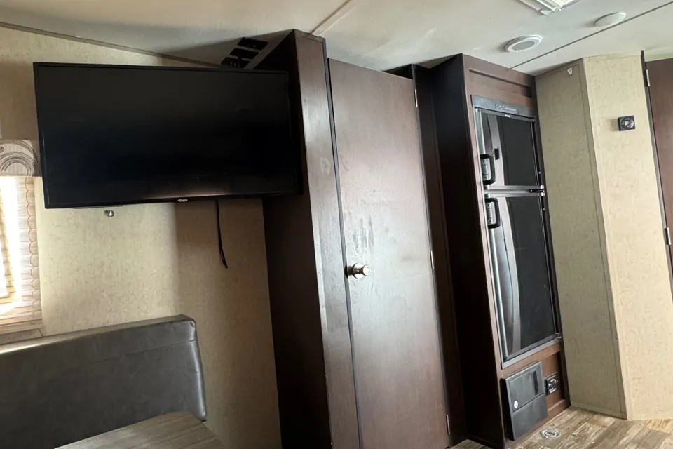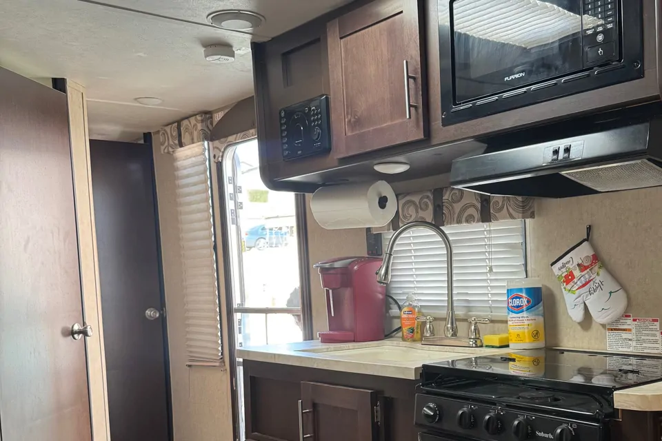 Our cross over toy hauler travel trailer named “Wolfie” has all the amenities of home yet is perfect for a great outdoor adventure where you can be steps away from nature. Fully equipped with a kitchen, refrigerator, microwave and oven, bathroom, shower, sink and toilet.