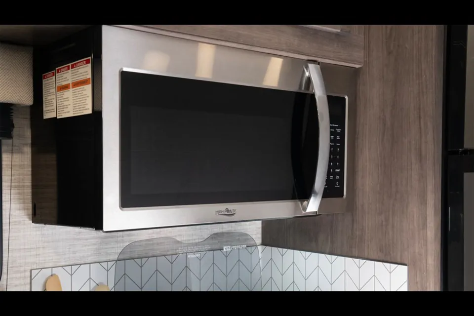 Kitchen: Two-burner cooktop, convection microwave, mid-size refrigerator, and LED-lit pressed countertops