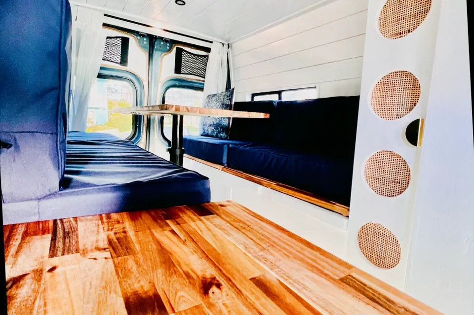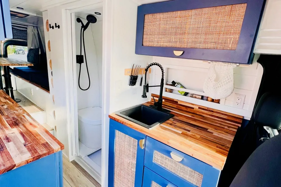 This brand new rig is a dream to drive and is jam packed with all the latest tech: 4 wheel drive, 7 different back up cameras, laser sensing drive assist, heated swivel chairs, lane assist, cruise control tech and an interior design that warms your soul. Hand crafted baltic birch cabinetry with cane faces and butcher block tops. Surrounded by soft white shiplap with linen curtains.... vibes are high.