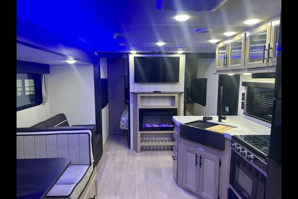 Inside, enjoy the roomy slide-out living area, full rear bath with large shower, and a modern kitchen equipped with a refrigerator, stove, convection oven/microwave, and plenty of storage. Outside, the fun continues with a full outdoor kitchen featuring a refrigerator and ice maker, plus an oversized awning with LED lighting for shade and evenings outdoors.