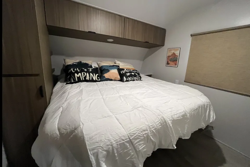 From the moment you step inside, you’ll appreciate the open and inviting interior. The large slide-out expands the main living and dining area, creating more room to relax together, enjoy meals, or unwind after a day of exploring. The fully equipped kitchen includes a three-burner cooktop, refrigerator, microwave, and sink with plenty of counter space—perfect for preparing home-cooked meals on the road.