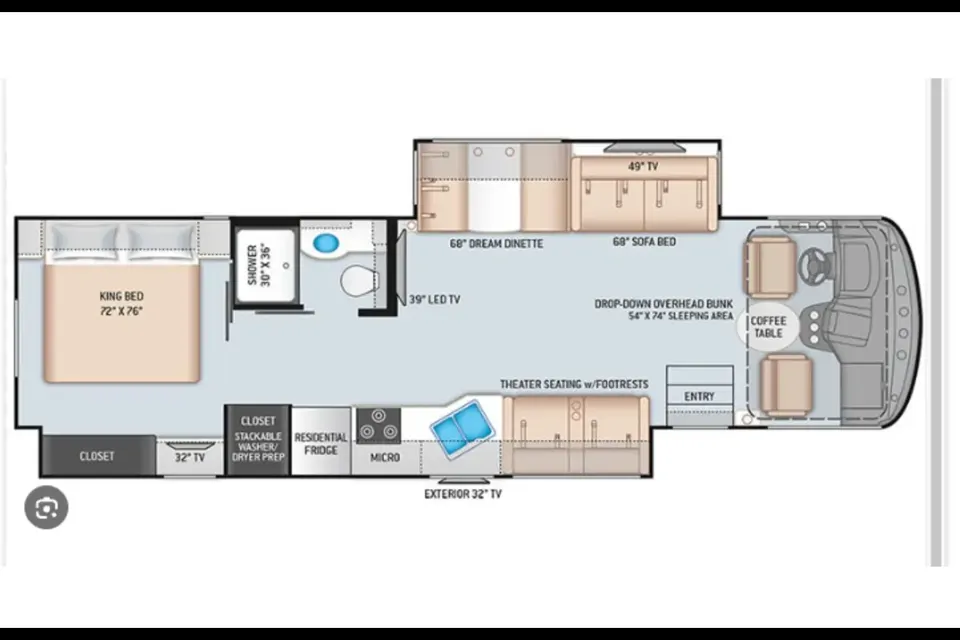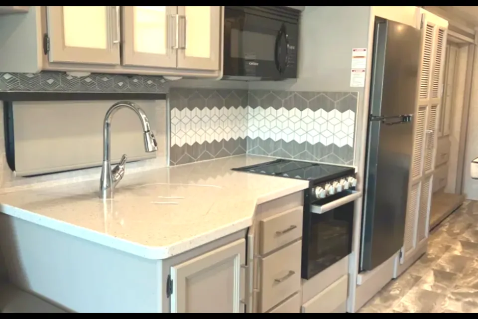 With its full-wall slide and thoughtful layout, this RV feels incredibly spacious inside, even when the whole family’s aboard. The king bed, big kitchen, and luxurious touches give you all the comfort of home—while the outdoor entertainment setup adds fun around the campfire. It’s big enough to host, yet smooth enough for first-time Class A drivers to handle confidently.