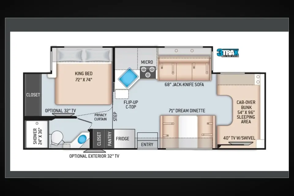 At just under 30 feet, this coach can fit in most campgrounds but still gives you the space you want on the inside. It’s an ideal choice for first-time RVers, small families, or couples who want to hit the road in style without the learning curve of a larger rig.