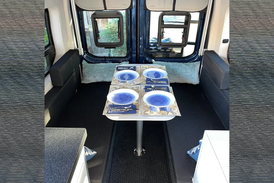 Van comes with pots, pans, plates, utensils, propane BBQ, everything needed to cook and serve meals.