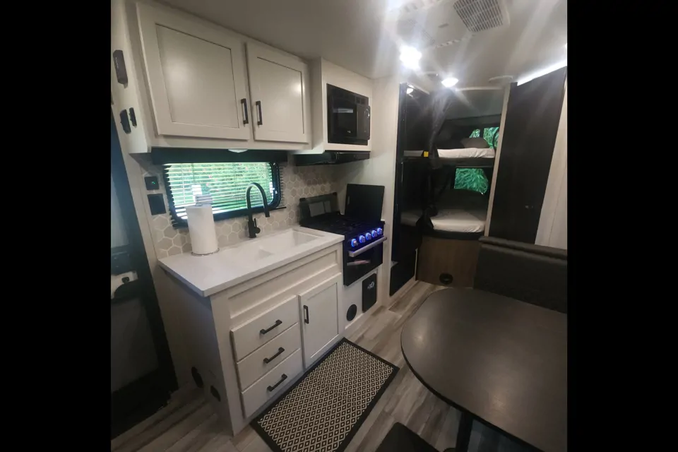 2024 Jayco Jay Flight travel trailer with 2 bunk beds, 1 queen bed, 1 Dinette that converts to bed. The kitchen is fully equipped with stove top, microwave, Oven and 12v refrigerator. There is also an outside mini fridge and an optional add on griddle that can mount to rear bumper.