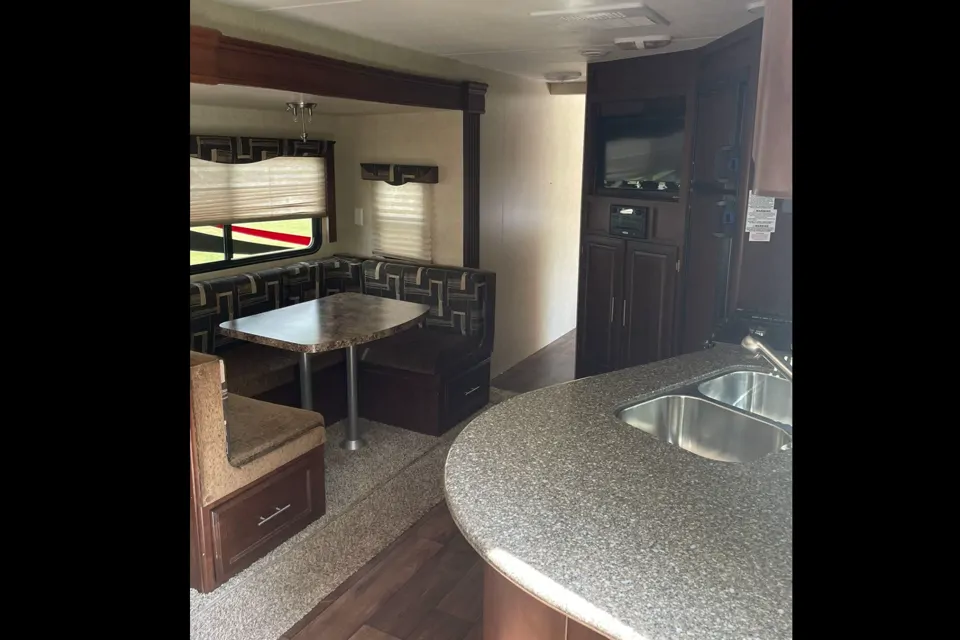This trailer is perfect for beach camping with the large rear window for enjoying a morning coffee with a view. Has a gas connection for a grill outside. Equipped with 2 30lb propane tanks and 100 gal freshwater, 60 grey and 40 black so also great for those long desert trips. Trailer comes equipped with cookware and some reusable dishes/cups, Keurig coffee maker, toaster, cutting board and cutlery. Dish soap and paper towels along with cleaning supplies are also included.