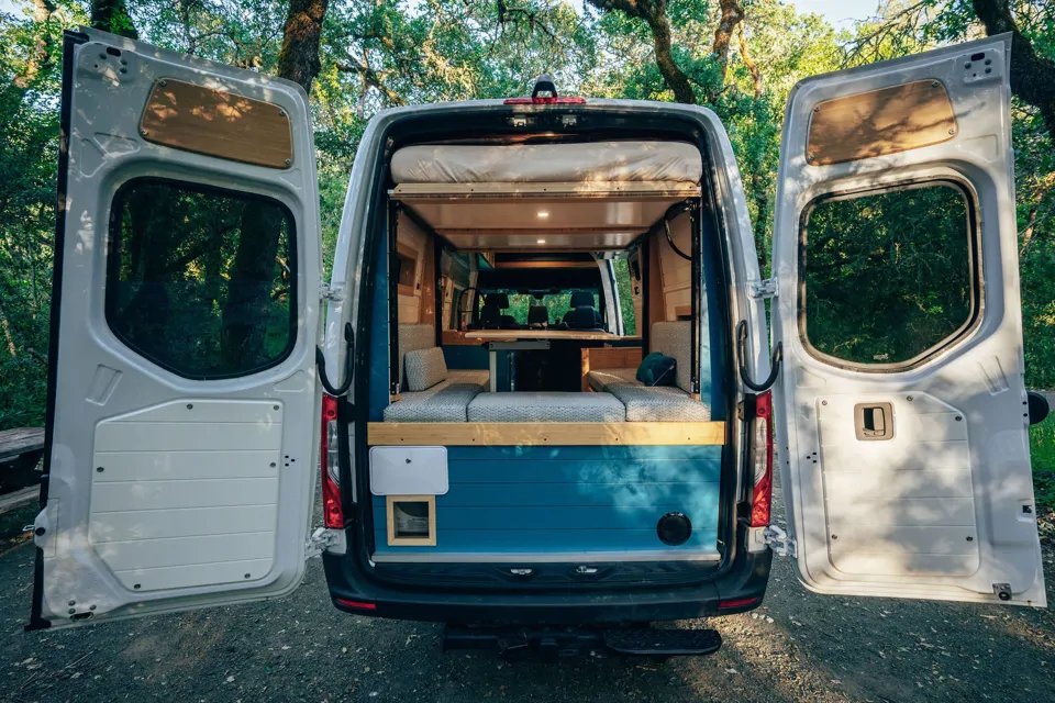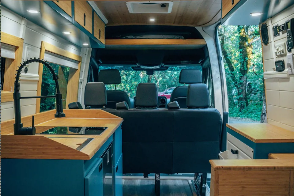 The Carmel is the perfect adventure vehicle for the entire family! Complete with a dinette for four to eat amazing meals that transforms into a queen bed at night and then magically with the push of a button, a full bed descends from the ceiling. The van has beautiful finishings including custom cabinetry, wood paneling, and decor.