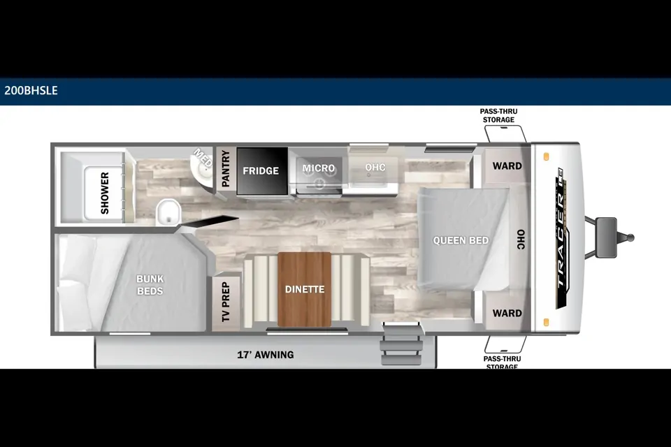 The Tracer 200BHSLE is a fantastic rental unit because it hits the "sweet spot": it’s lightweight enough for many SUVs and light trucks to tow, yet it features those coveted double-over-double bunks.