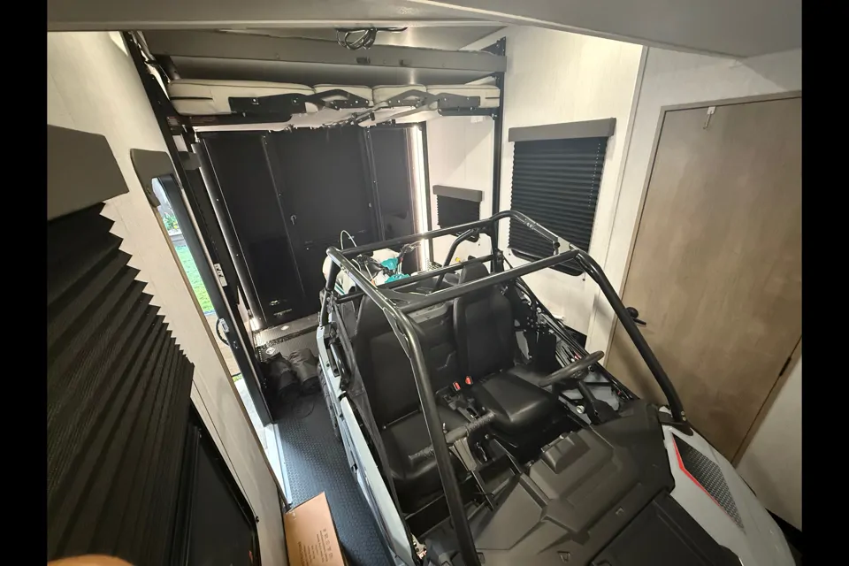 This beautiful toy hauler will provide the necessities of home wile away on jour journey. The master has a queen bed, plenty of storage for extended stays, a Smart TV, its own AC, black out shades , tinted double pane windows. The main area has a full kitchen with full size refrigerator, 4 burner stove, oven, microwave along with cooking pots, pans and utensils. We also provide paper plates, cups, plastic utensils and a coffee maker. The living room has a sectional with pull out bed and a love seat on the side. 3 seats recline for comfortable TV watching. There is a 4 chair dining table. The 14 foot long garage has its own AC , half bath, queen bunk beds and a loft bed. Linens are included for all beds with pillows. If you don’t need the leave everything in the loft . Pull in the quads or the cart. I fit 2 quads and my kids cart just fine.The trailer has solar, and inverter for 110, and batteries. I’ll let you borrow a Honda 2000 with 5 gallons of gas to charge the batteries if your dry camping. There are 5 camping chairs in the storage compartment along with hose, extension cords and adapters for power.