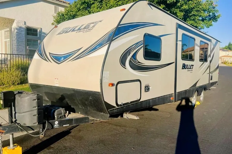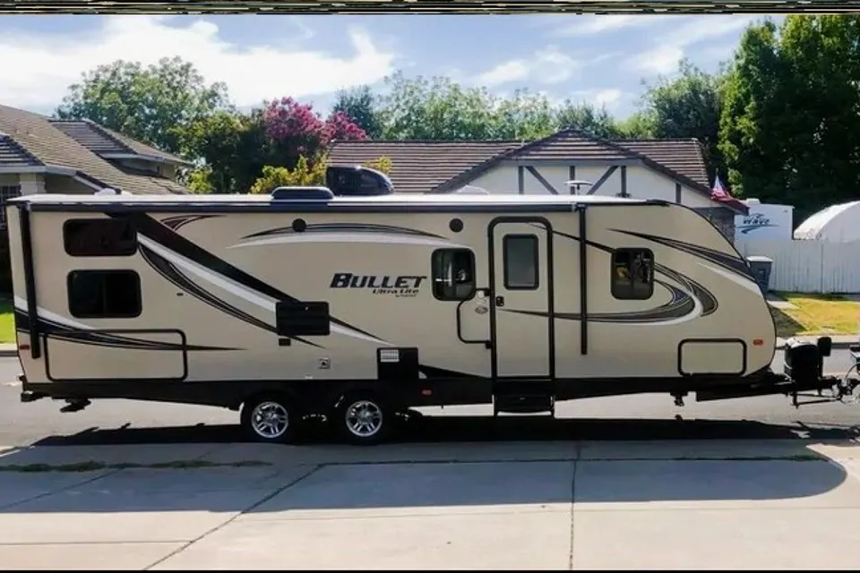 2017 Keystone bullet 27.10 footer, 5,470 lb dry weight, 555 lb hitch weight, enclosed bedroom with queen bed, fold out leather couch bed, dinette table turns into bed, double bunk, kitchen with utensils, pots and pans, double sink, microwave, stove top and oven, fridge and freezer combo, a/c and heater, fully electric awning with led lighting, manual leveling jacks, outdoor fridge, couple folding chairs included in storage, bathroom is shower/tub combo, radio with outdoor speakers, smart tv, dual propane tanks(must pre pay for them to be pre filled or if you plan on using them they will get charged), pass thru under storage. I have the hitch and weight distribution bars needed for tow. Fire pit for rent also. No bedding, or pillows provided renter must bring their own, sheets can be provided upon request. 30 amp service, pets at extra cost discussed with owner, pet fencing included. Text owner with extra questions 707-344-0060 if dry camping and seller has to dump septic it’s an added charge. Fridge runs on electric or propane.