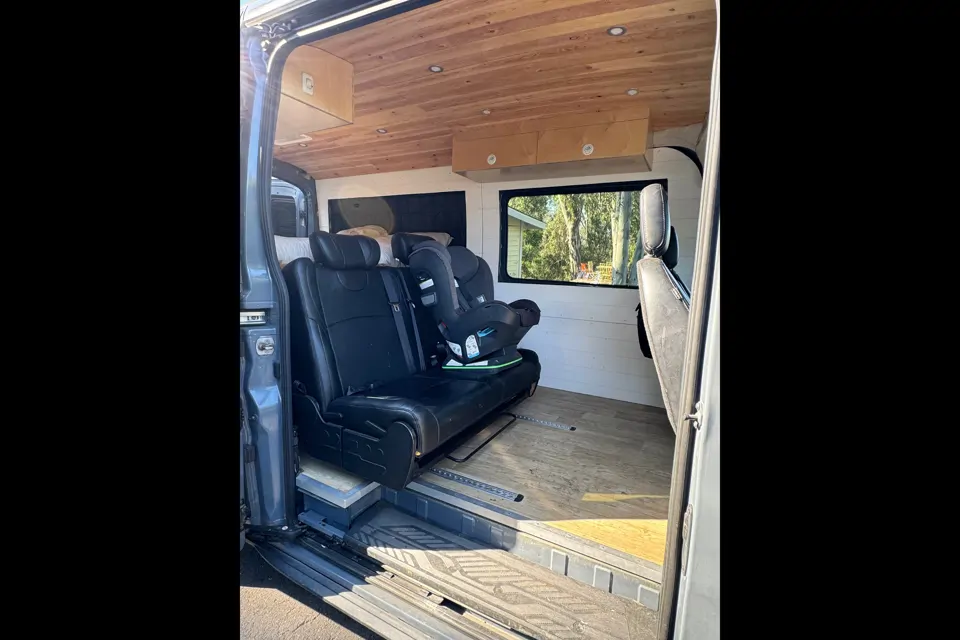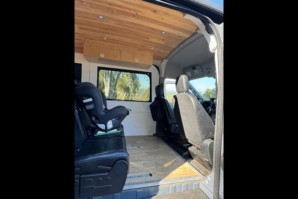 Four seater Ford Transit ready for your adventures! Queen size tempur pedic bed with linens set up and ready for you. Fold down full size bed converts from seat for anyone who would like an extra bed.