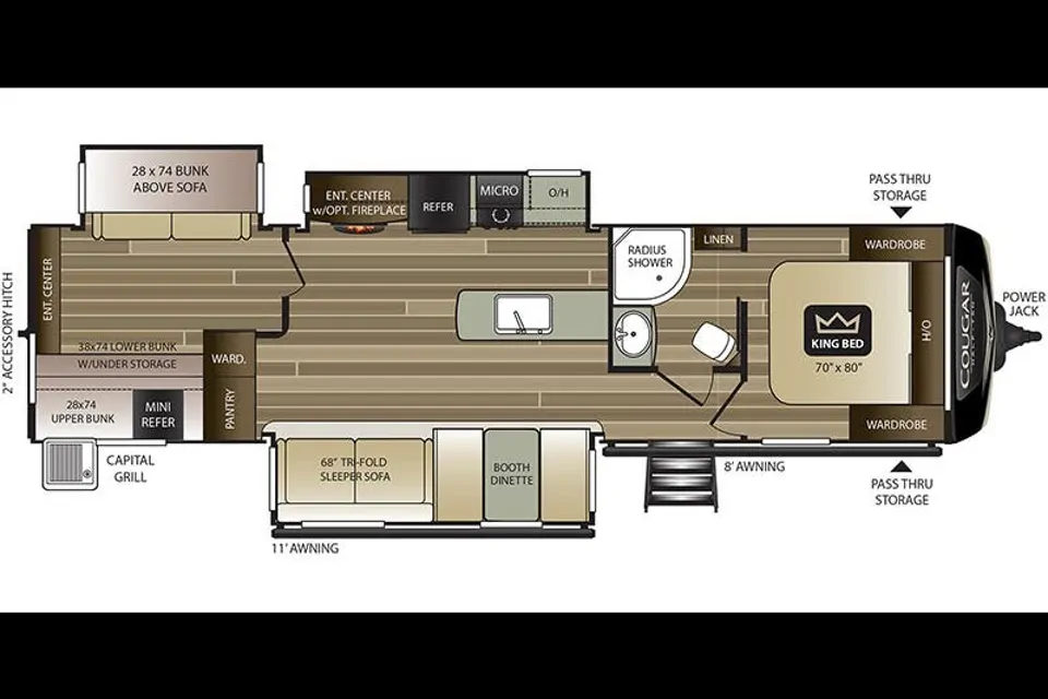 The fully equipped kitchen includes a refrigerator, stove, oven, microwave, and plenty of counter space, making it easy to cook meals on the go. Outside, you’ll love the large awning for shade, exterior storage for all your gear, and the convenience of easy setup once you arrive at your campsite.