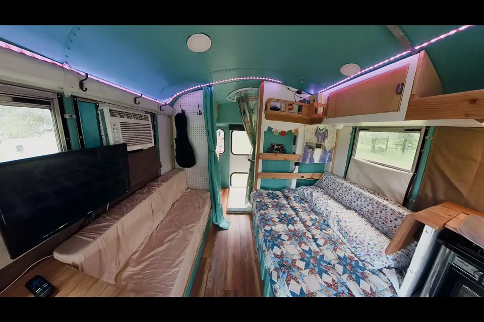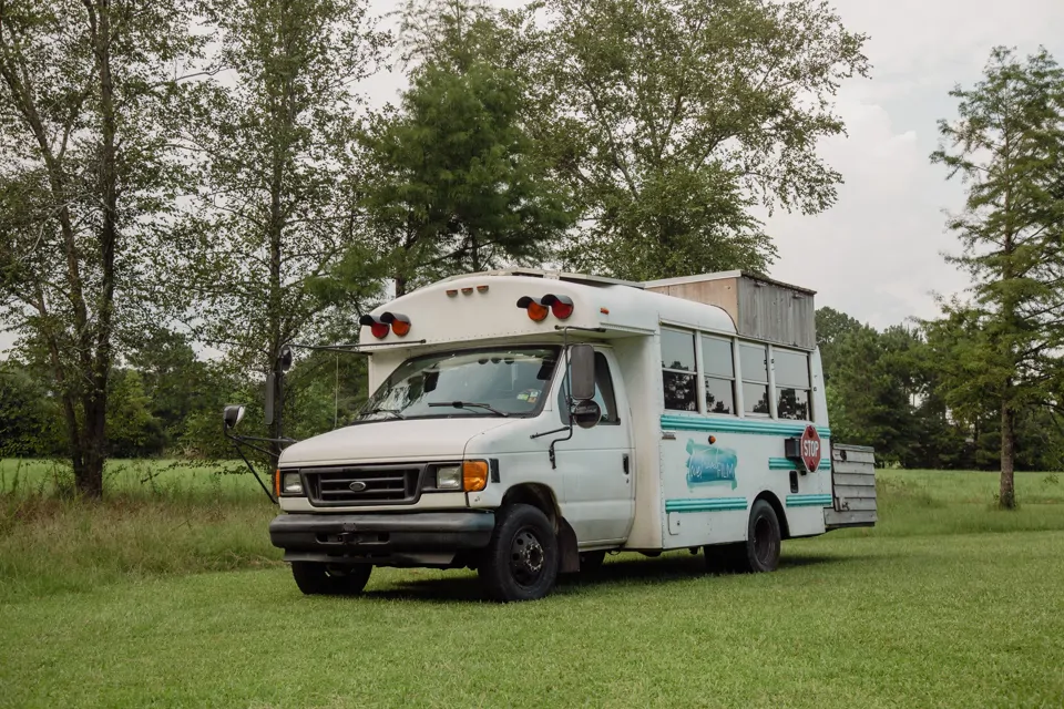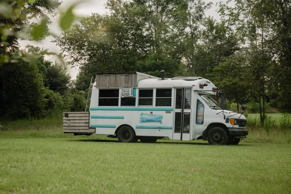 Welcome to the Love Travel Film Bus! It is the fruit of our labors and we would love to share it with you! This is a 2005 Ford E-350 van chassis with a Thomas built bus body, converted to a home featuring off grid capabilities such as solar, 200 AH of lithium batteries, cubic mini woodstove and both indoor and outdoor showers! We designed the space to be efficiently cozy and snug with all of the comforts of home. Whether you are sitting back and enjoying a movie on our custom built table computer or laying on our top deck watching the stars, life is always better in a skoolie.