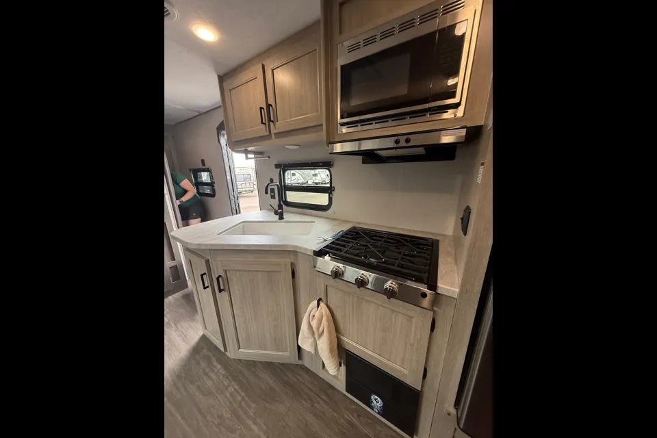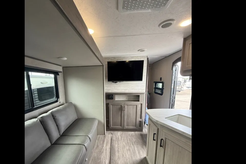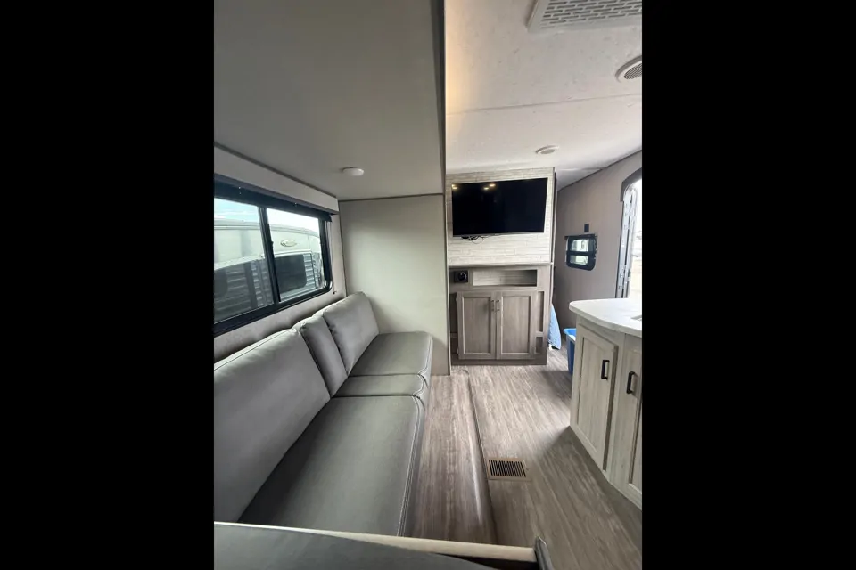 Everyone will have a comfortable time camping in this travel trailer! It features a set of double sized bunk beds for the kids or guests to sleep on and are conveniently next to the rear corner bathroom which has a tub/shower with a skylight above for added natural lighting. The booth dinette and sofa slide opens up the kitchen area so you have more space to prepare your best meals with the three burner cooktop. When you're ready to wind down your nights, grab a snack from the large pantry, a beverage from the 10.7 cu. ft. refrigerator, and place your drink in the cupholder/arm rest of the sofa while you watch a movie at the entertainment center!