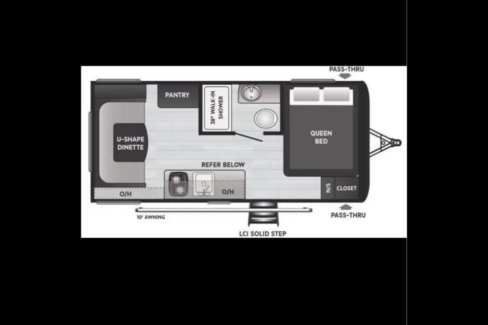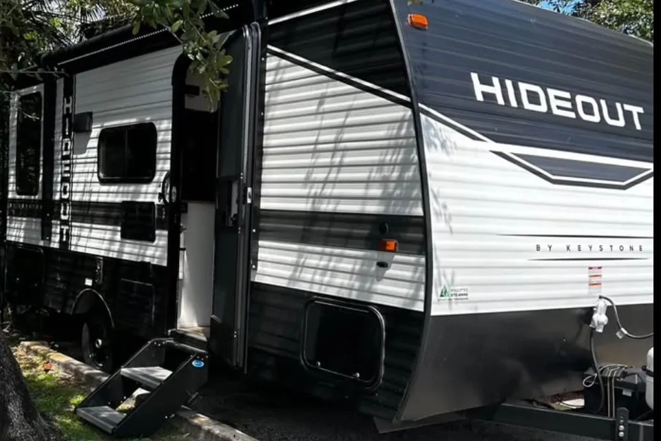 Enjoy your adventures in our Hydeout 17 travel trailer! Perfect for couples or small families, it features a queen bed, convertible dinette, full kitchen, bathroom with shower, and AC/heating. Optional add-ons include camping chairs, BBQ, and bedding. Pets welcome with approval. No smoking inside. Comfort and convenience wherever you go!
