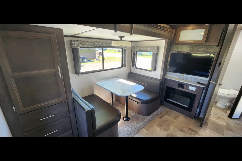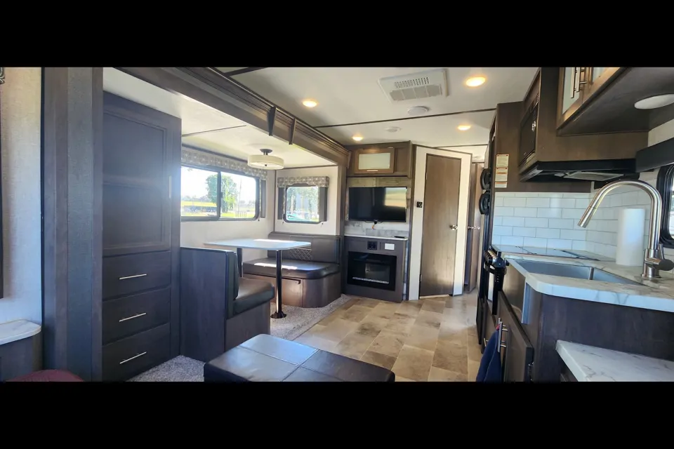 Delivery and setup is recommended and available. This rv will sleep 5 comfortably. The sleeping arrangements include a private queen bedroom forward, a convertible dinette and a jackknife sofa in the rear. This rv is fully stocked including bed linens, bath towels and kitchen essentials ( coffee pot, dishes and cups, dish towels, pot holders, pots and pans and silverware ). Upon entering this rv you’ll feel right at home. It features natural dark wood cabinets its doors highlighted with a soft frosted glass insert. This rv has 2 tvs, one is located in the private queen bedroom and the other is in the living area. You can comfortably sleep five people. It also has a Bluetooth stereo with both inside and outside speakers. It would be perfect for a couple or small family looking to get away from the everyday grind. We try to provide everything that we think you may need to make your stay as enjoyable as possible. We do allow pets but please make sure that you and your pet respect the interior of the rv.