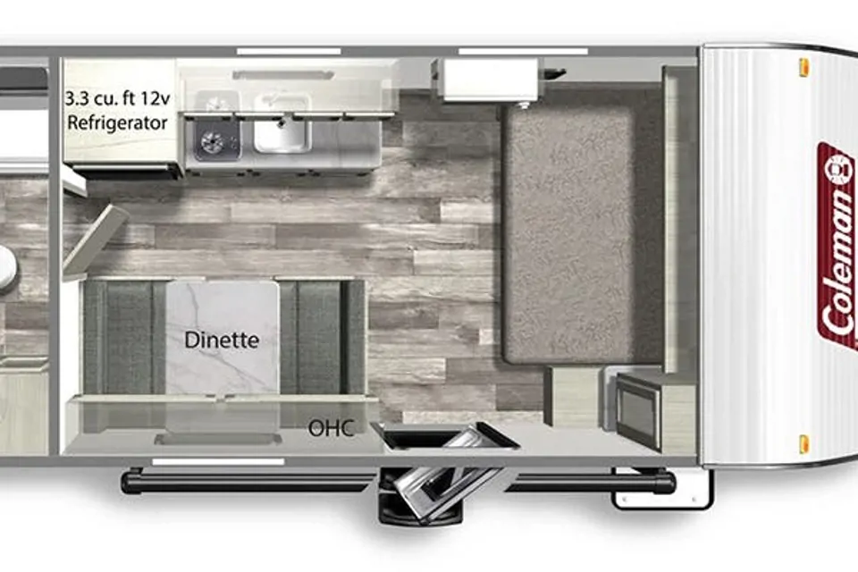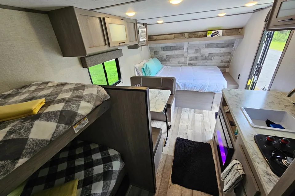 Brand new unit with upgraded memory foam Queen bed, 2 single bunks (bottom bunk with memory foam topper), dinette, fireplace, shower, toilet. Perfect upgrade from a tent. Lightweight & easy tow.