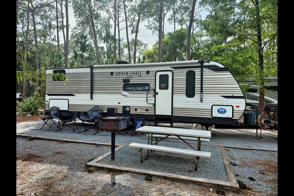 Enjoy camping in style with all the comforts of home for you and the kids! Located in Central Florida, you can haul this 29' travel trailer or we can do it for you. Enjoy a comfortable queen size bed up front, bunks in the back for the kids, recliners and a dining table with plenty of room with the slide out, cooking food, taking a warm shower, or watching tv!