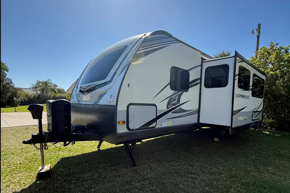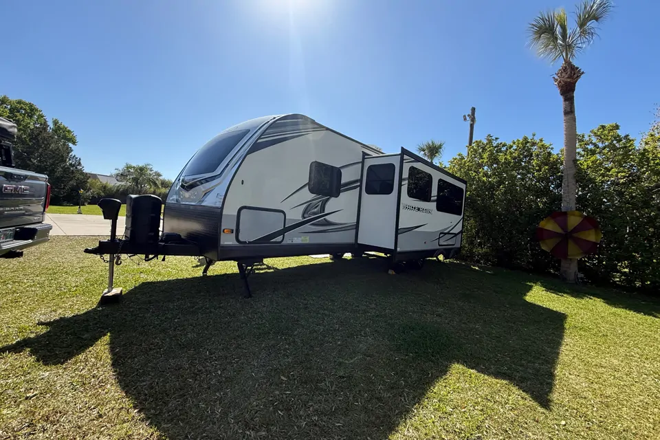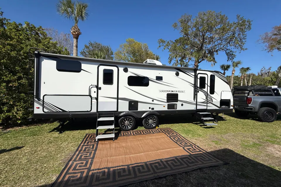 Brand new and up to date style. Master bedroom has large window at the head of the bed. Queen master bedroom in the front with Large closet for longer stays, plenty of storage for all your belongings. Double bunks that can sleep 1 or 2 per bunk. The sofa and dinette can easily be turned into extra sleeping space. Bathroom with a spacious shower. The living area has a large smart TV where you can stream movies. We provide 2 camping chairs and an outdoor rug. Large pantry and storage areas. Tinted windows to block out the heat while enjoying the views from the large windows. It is filled with features to enjoy from exterior Bluetooth speakers, power awning with LED lights, Outdoor kitchen with mini fridge and a Blackstone grille, and an outdoor shower.